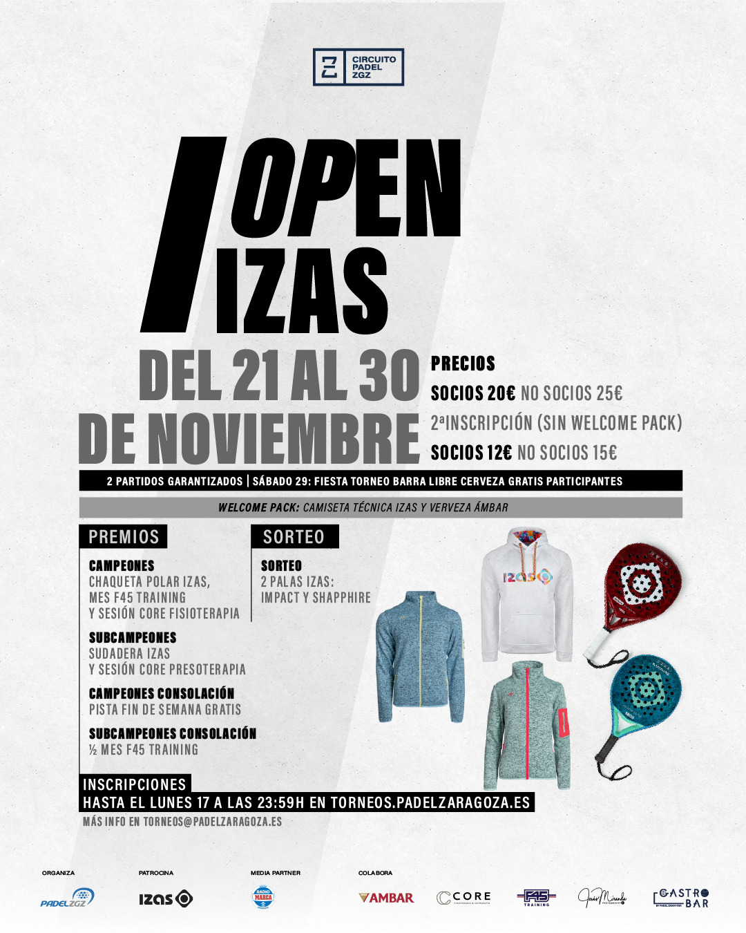 Fechas: del 14/11 al 23/11 (todas las finales ese domingo por la tarde). Welcome Pack: Camiseta técnica Izas (PVP 16€) y cerveza Ámbar. Gúia de ta...