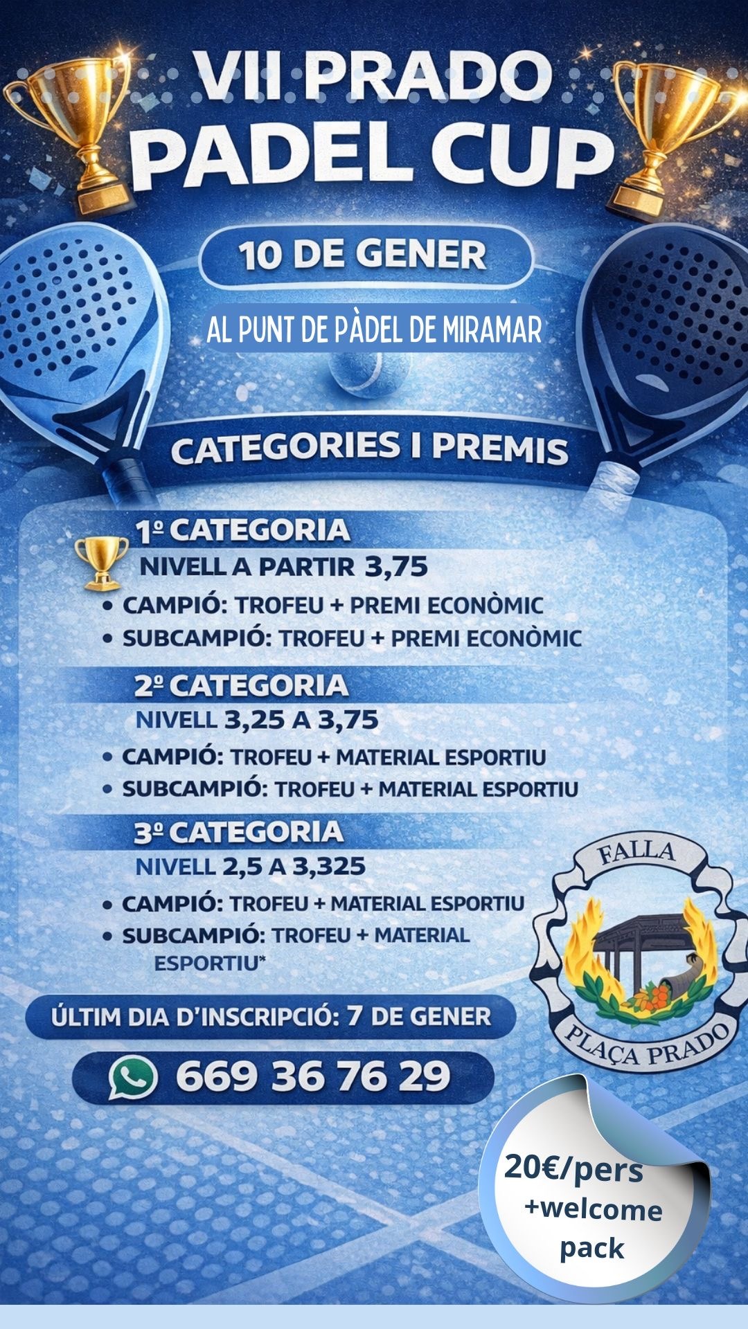 El 'VI PRADO PADEL CUP' se celebrara el sabado 11 de enero en las instalaciones de Punt Esportiu de Miramar, estará compuesto por tres ca...