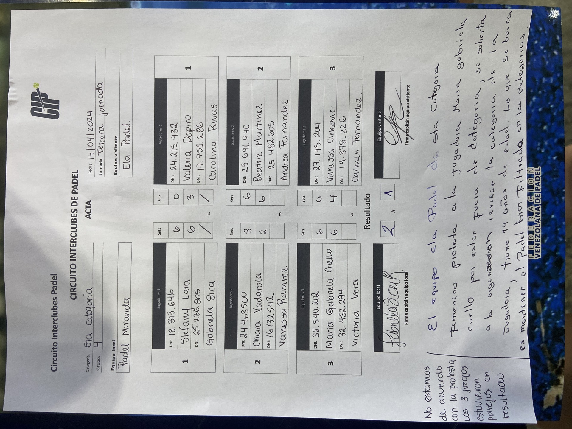 El equipo ELA pádel de 5ta categoría femenino protesta a la jugadora María Gabriela Coello por estar fuera de categoría, se solicita a la organización revisar la categoría de la jugadora, tiene 14 años de edad. Lo que se busca es mantener al pádel bien filtrado en categoría.