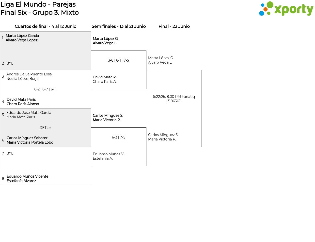 Fase de Grupos - 1 Fase de Grupos - 2 Final Six - Grupo 1 Final Six - Grupo 2 Final Six - Grupo 3 Final Six - Grupo 4 Final Six - Grupo 5 Final Six - Grupo 6Mixto